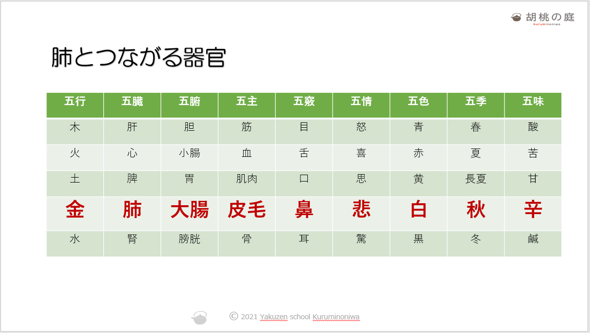 中医的な視点を持つと、肺と意外なところがつながっていることが分かります。季節では秋と関係しますので、秋は特に気をつけています。このあたりも講座で紹介します。